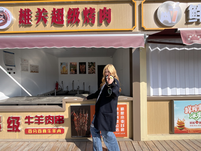 A female subject stands smiling in front of an open food stall under direct sunlight in Jiayuguan, China