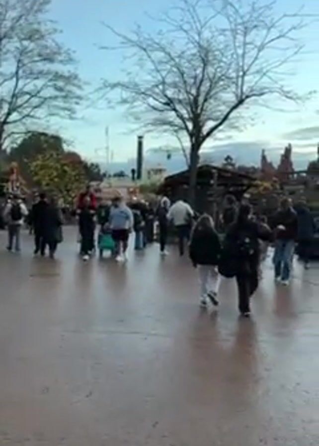 busy pedestrian walkway in an outdoor area, possibly a theme park, under a cloudy, blue-tinged sky. There are many people, mostly adults, walking in various directions, some with children or pushing strollers. The ground is wet and shiny, suggesting recent rain. Bare trees are visible on either side of the walkway. In the background, there is a distinctive rock formation resembling a mountain or butte, decorated with what appears to be Halloween-themed decorations like pumpkins and sunflowers. There are also buildings and other structures visible, adding to the impression of a bustling outdoor attraction.