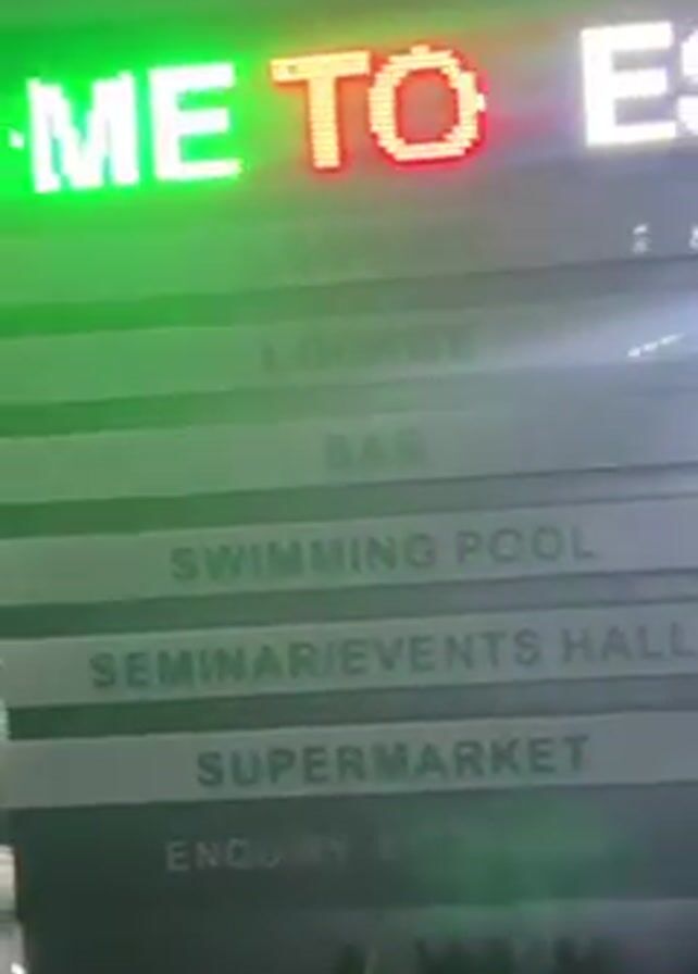 sign that reads "Welcome To Essence Place" in illuminated green, red, and white lights. Below it are listed "Lodging," "Lounge," "Bar," "Swimming Pool," "Seminar/Events Hall," and "Supermarket." At the bottom is an inquiry number. The background is slightly blurry. There are plants at the very bottom of the sign. The video is shot at night.