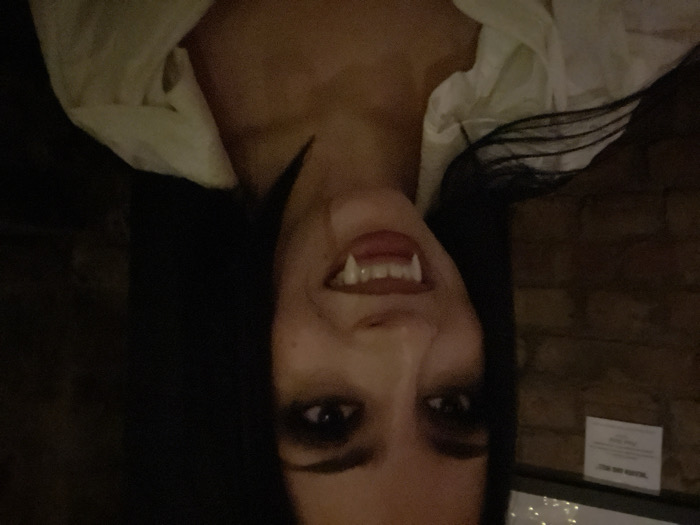 A female individual is depicted in a close-up, chest-up portrait, costumed as a vampire