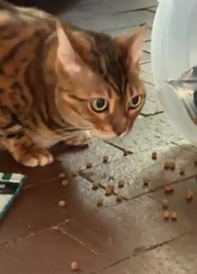 A Bengal cat is seen in the video on a dark tile floor next to a tipped-over white bucket and an open bag of cat food, with kibble scattered around