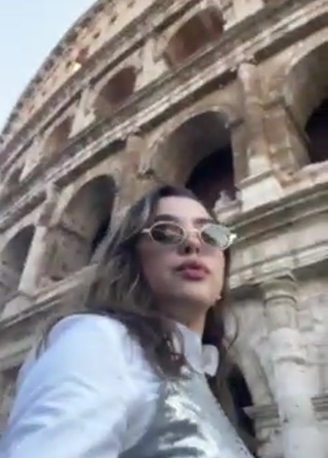 A young woman is recording a video of herself, seemingly with a phone, while standing near a building that is partially visible in the background. The building has a weathered, stone facade and is likely a historical landmark, possibly the Colosseum. The woman is wearing sunglasses, a white top, and a shimmering or patterned piece of clothing over her top. She has brown hair, and her lips are in a slightly pursed position throughout the video. As she moves, the background shifts, showing a bus and a tree. She also touches her hair. The light is bright and diffused, suggesting it could be daytime.