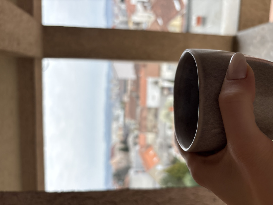 The scene depicts an elevated view of the city of Kragujevac, Serbia, framed by architectural elements of a building's balcony or large window. In the immediate foreground, a person's right hand, characterized by light skin tone and neatly manicured fingernails with a light, possibly nude, polish, firmly grasps a dark grayish-brown ceramic mug. The mug, which appears to contain a dark liquid, is the primary subject in sharp focus. The background presents a blurred cityscape dominated by numerous buildings featuring prominent red-tiled roofs, interspersed with lighter-colored structures and visible patches of green foliage. A hazy mountain range is discernible on the distant horizon, beneath an overcast or cloudy sky. The viewing platform includes a light-colored vertical column on the left and a horizontal beam at the top, suggesting a concrete or stone construction.