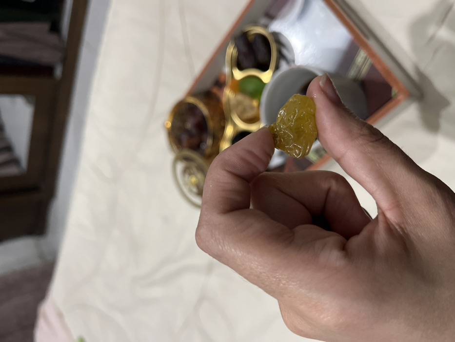 A person's hand, seen from a slightly elevated perspective, holds a single, translucent, yellow, irregularly shaped object—possibly a candied fruit or large golden raisin—between the thumb and index finger. The object appears moist or sticky. In the soft-focus background, a rectangular tray with an orange-brown rim rests on a light-colored, textured surface, possibly a bedspread. On the tray, a small white cup contains a dark liquid, alongside an ornate golden lidded container and a segmented golden dish holding an assortment of items: dark-colored dates, lighter dried fruits, and a single green piece. Distant background elements include blurry, dark-toned furniture. The scene is an indoor setting in Nuseirat, Palestinian Territory.