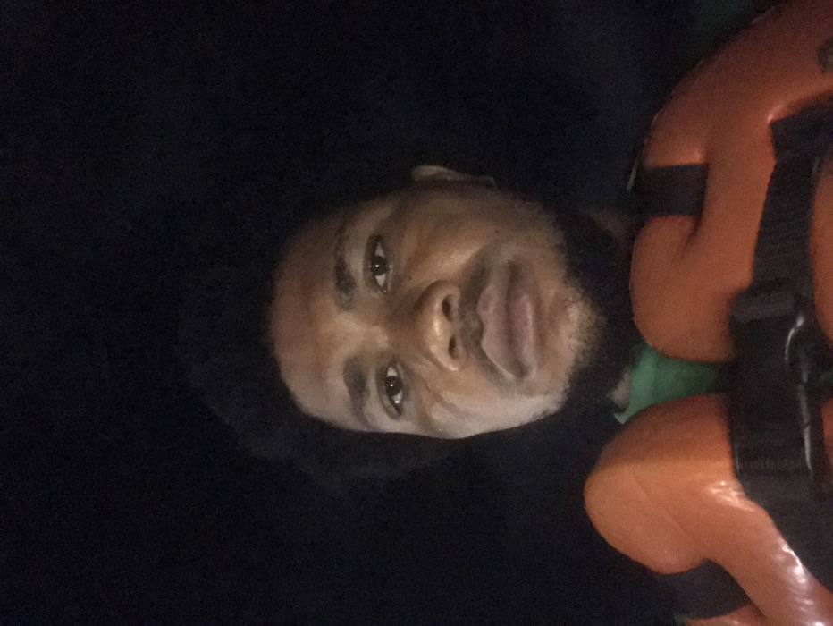 A man with dark hair and a trimmed beard is facing the camera. He is wearing a bright orange life vest. His skin has a slightly glossy appearance. The background is predominantly dark, almost black, providing a stark contrast to the man's features and the life vest.