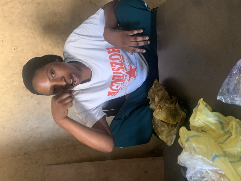 The image depicts a young adult female seated indoors in what is consistent with a private or informal setting in Okene, Nigeria. She has dark skin, wears a black head covering, a white short-sleeved t-shirt bearing "AGNUSZOH" in red capital letters with a red star graphic, and dark teal track pants. Her right hand is raised near her mouth, suggesting the action of eating or cleaning, with her mouth slightly ajar. She looks directly at the viewer. On a dark surface in the foreground, an item of food wrapped in a leaf and translucent plastic is present, along with a crumpled yellow translucent plastic bag and another clear plastic bag. The background features a plain, light brown, roughly textured wall, with a vertical dark rectangular object leaning against it on the left.