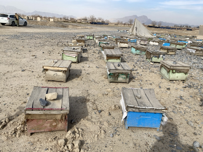 An outdoor apiary is depicted in Nakhonay, Afghanistan, featuring numerous weathered wooden beehives arranged in rows across a dry, stony, and sandy landscape
