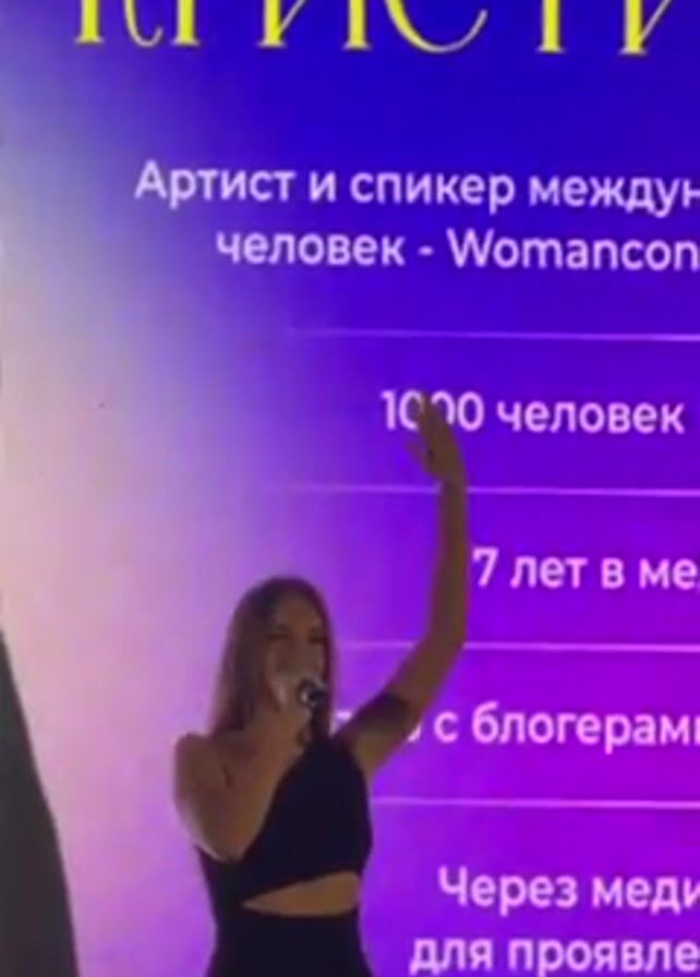 A woman with long brown hair performs on stage holding a microphone. Behind her, a screen displays her name “КРИСТИ” in yellow letters over a dark blue background along with text and other information. As the video progresses, a portrait of her and a QR code appear on the screen. The room is dimly lit, with light focused on the stage area.