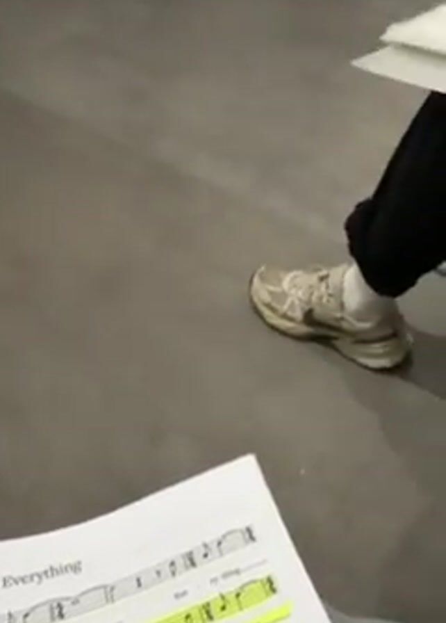 group of people participating in a music rehearsal. The camera focuses on a sheet of music with highlighted passages, indicating a specific part or focus point. The scene then pans up to reveal the participants, including a woman playing a keyboard and leading the group. There are other individuals present, some sitting and others standing, all with sheet music in hand. The room has a minimalist aesthetic with white walls and a gray floor. The focus is on the musical activity and the interactions between the conductor and the participants.