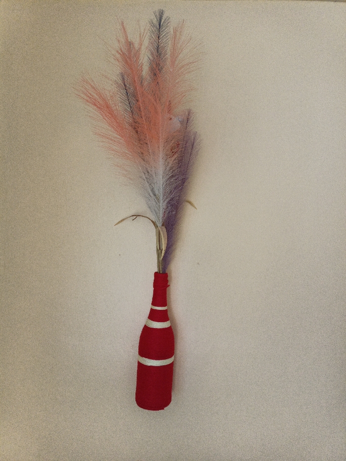 A decorative arrangement, consisting of a red-covered bottle holding a plume of multicolored feathers and dried plant material, is depicted against a plain, light beige wall