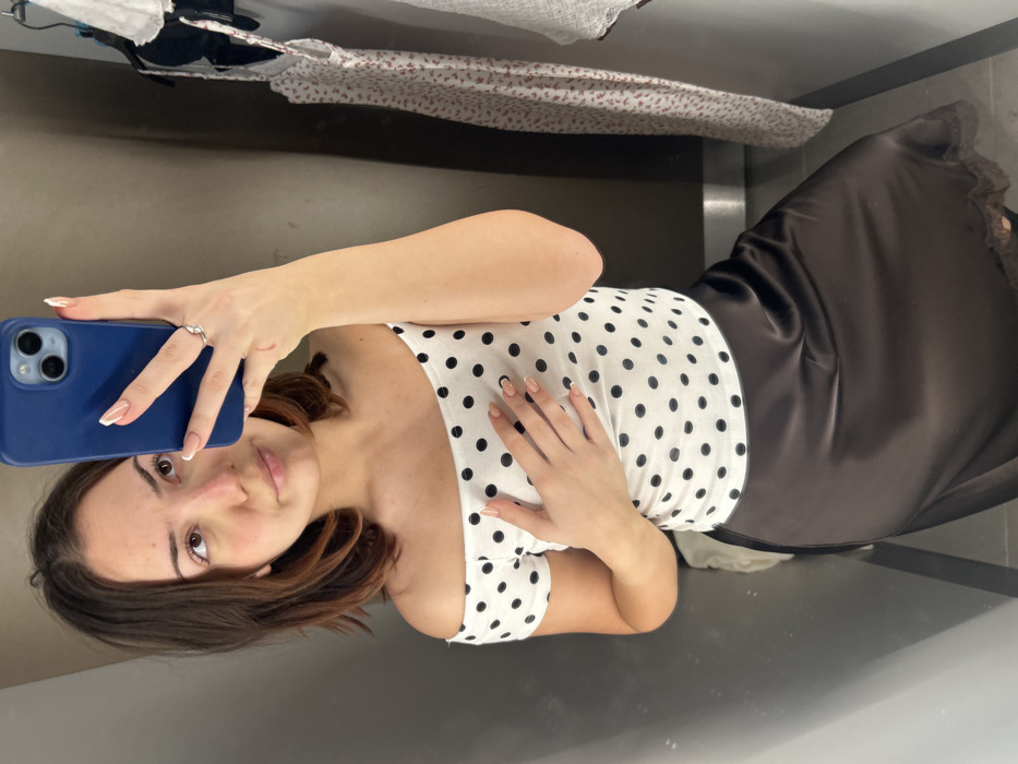 The scene depicts a female individual taking a mirror selfie inside a changing room in Reichstett, France. The subject, a woman with brown bob-length hair and fair complexion, is positioned centrally, looking upwards and to the right. She is wearing a white off-the-shoulder top with black polka dots and a dark brown satin-like midi skirt featuring a lace hem. Her right hand holds a blue-cased smartphone, used to capture the image, revealing a silver-toned ring with a clear stone on her left ring finger and French-tipped fingernails. Her left hand rests on her chest. In the background, to the right, other garments including a white and red floral patterned dress and a white sheer item are visible hanging on a rail within the fitting room's dark-paneled interior. A metallic horizontal strip is present at waist level on the right wall.