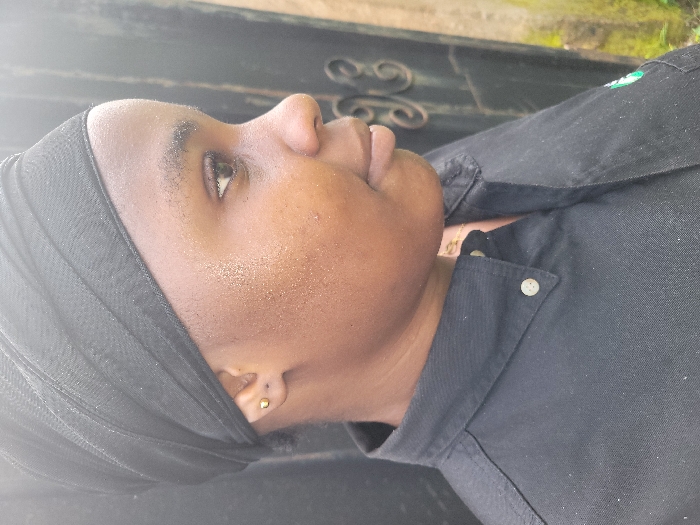 An adult female of African descent is depicted in a close-up, right-profile shot, situated outdoors in Takau, Nigeria