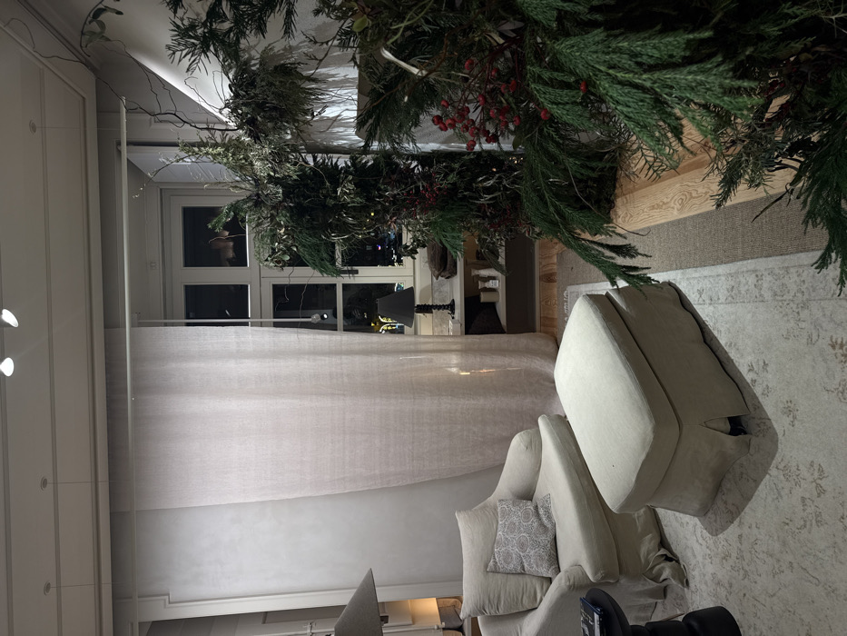 A room with muted tones features a large window covered by a sheer curtain. Lush greenery hangs from the ceiling, obscuring part of the window. Below, a beige couch with patterned throw pillows sits on an ornate rug. An adjacent beige chair is positioned on the rug. A partial view of a table with electronic devices is visible in the foreground. A lamp and other decorative elements are placed near the window.