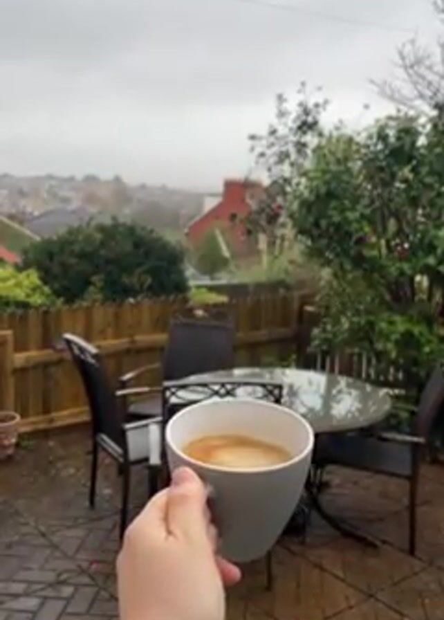 hand holding a grey mug full of coffee outdoors on a rainy day. The mug is then placed on a glass-topped table surrounded by four chairs on a brick patio. A low wooden fence separates the patio from a yard with various shrubs. In the distance, a neighborhood of houses is visible against an overcast sky. Raindrops are visible on the table and the patio.