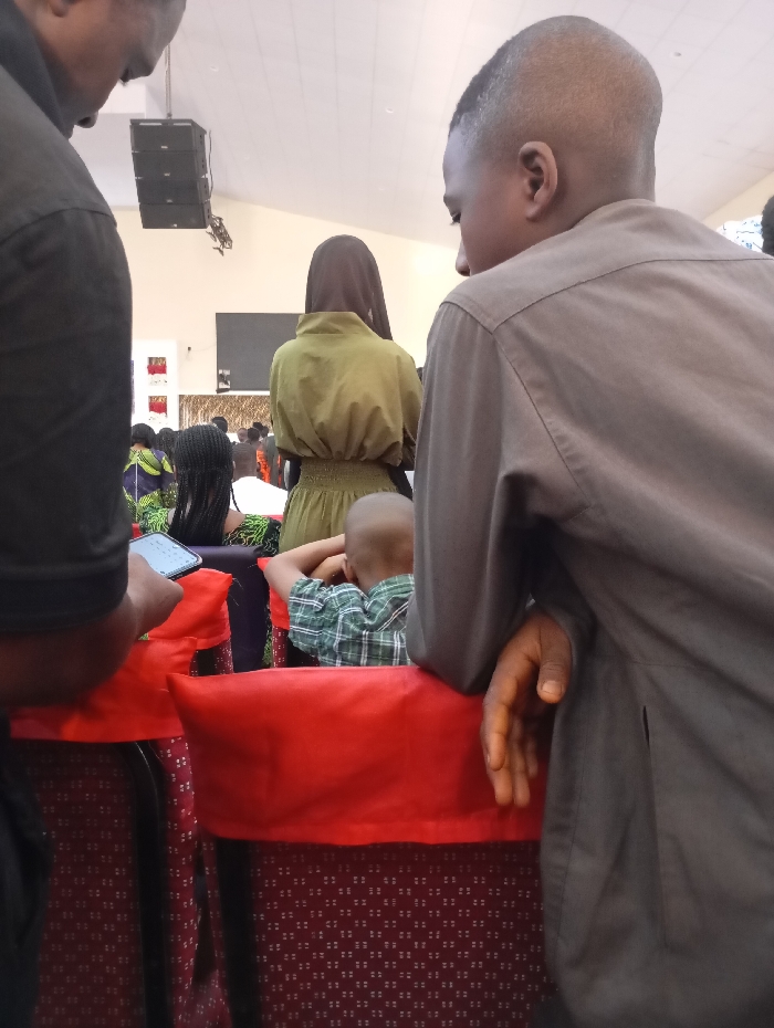 A shot captures an indoor scene filled with people in an assembly. A man in a black shirt holds a phone in the lower left. Next to him, two rows of red cushioned chairs are visible. A child in a green shirt rests his head on the chair in front. Behind the child, a woman in a green dress and head covering stands out. Further back, additional people are seated. The man in the gray shirt stands by the second row. A large speaker system hangs from the ceiling.