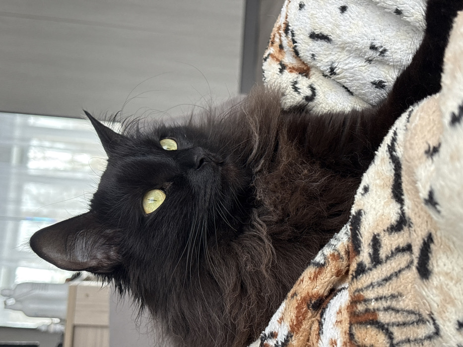 - "The image displays a long-haired black cat with bright yellow-green eyes, positioned indoors" by FM-SFk932, licensed under CC BY 4.0