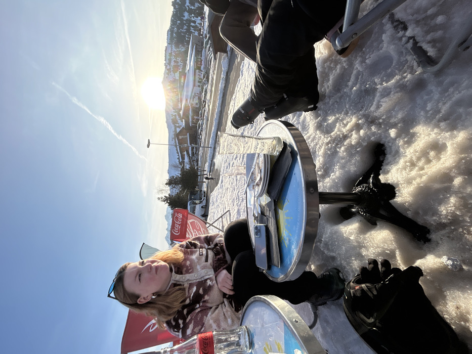 A sunny outdoor scene captures a group at an outdoor café amidst snow. A young woman sits in a Coca-Cola branded chair, gazing upwards. A table holds a cell phone, plates, napkins, and a glass. A person in ski boots stands nearby, with another individual's legs visible in the frame. The background reveals buildings and a mountain landscape under a clear, bright sky with contrails.
