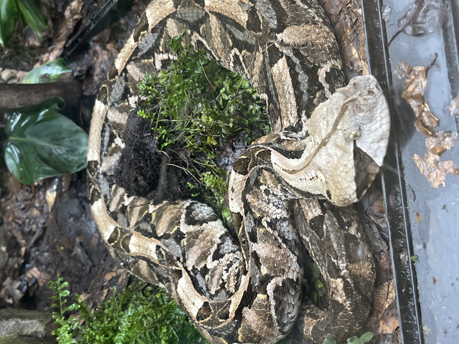 - "A large Gaboon viper (Bitis gabonica) is centrally positioned, coiled and at rest, within an enclosure located in Mulhouse, France" by FM-rLGAz2, licensed under CC BY 4.0
