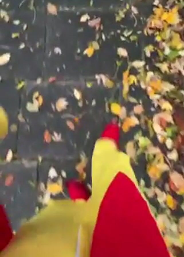A person wearing a yellow and red outfit walks on a pavement covered in fallen leaves