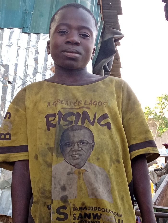 A young boy stands facing the camera, wearing a yellow t-shirt. The shirt features the words "A GREATER LAGOS RISING" printed in brown, along with a portrait of a man in a suit and tie. The text "Babajide Olusola Sanwo-Olu as Governor" is also visible on the shirt. The background appears to be a cluttered outdoor area, possibly a residential neighborhood. The boy's expression is neutral, and his dark hair is short.