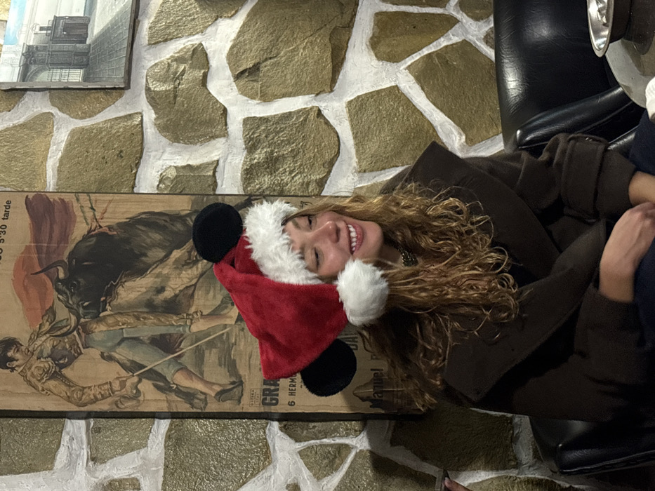 An indoor scene in Puebla City, Mexico, depicts a young woman seated in what appears to be a restaurant or bar. The woman, with fair skin and long, curly reddish-brown hair, is smiling and looking slightly to her right. She wears a red Santa hat adorned with white fur trim and two prominent black circular elements resembling Mickey Mouse ears. Her attire includes a dark brown or black jacket/top and dark pants. She is seated on a dark, possibly black leather, booth or sofa. To her immediate right, a small metallic container, possibly an ashtray, rests on a dark surface. The background features a textured wall constructed from irregularly shaped, light brown/gold-colored stones with white mortar. A large, vertical poster on the left depicts a bullfight scene with a matador and a bull, displaying Spanish text including "GRAN" and "5:30 tarde." Above and to the right of the woman, a smaller, rectangular artwork portrays an architectural structure with arched entrances, possibly referencing a historical gate or building common in Puebla, such as a fort. The overall environment suggests a casual, culturally themed establishment.