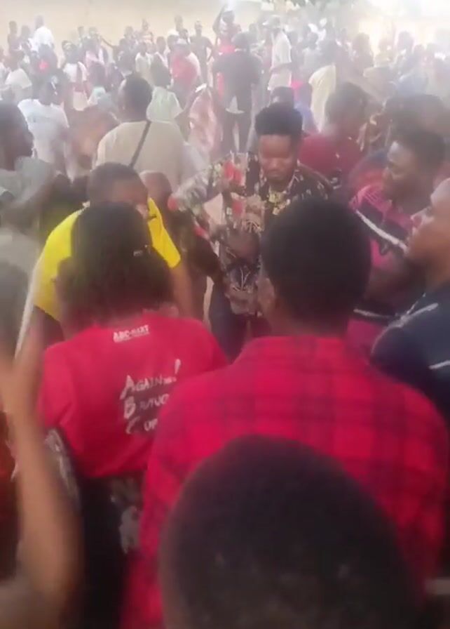 large crowd of people outdoors, mostly men, many of whom are moving or dancing. Several people are wearing red shirts. In the center of the frame, a man in a colorful shirt is surrounded by others. The scene appears to be a celebration or gathering. The video is shot from within the crowd. Overhead, trees partially obscure the view. The text "Infinix NOTE 30 Pro" is visible at the bottom of the screen.