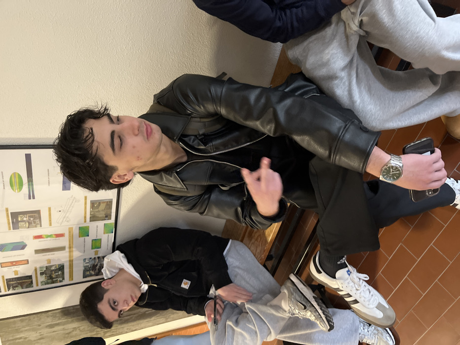 The image displays three young adult males seated on a light brown wooden slatted bench within an indoor setting in the city of Vila Real, Portugal. The floor consists of terracotta-colored square tiles arranged in a grid pattern. The wall behind the subjects is painted a light cream color and features two framed academic posters containing diagrams, text (including Portuguese phrases), and schematic illustrations. The male in the foreground, seated on the right, wears a black collared leather jacket over a black zipped garment, black pants, and white and grey Adidas Samba sneakers. He has dark, wavy hair, prominent eyebrows, and visible acne on his right cheek. His right hand holds a black smartphone, and a silver-toned wristwatch with a dark face is on his left wrist. His left hand is raised, with the index and middle fingers extended in a gesture. He is looking downwards and to his right, away from the camera. A dark backpack strap is visible over his right shoulder. To his left, the middle male wears a black Carhartt jacket with a visible white hooded sweatshirt underneath, grey sweatpants, and silver Nike athletic shoes. He has short dark hair and is holding a dark smartphone in his right hand, looking directly at the camera. The third male is partially visible on the far right, seated next to the foreground male. He is wearing grey sweatpants and light brown boots or shoes.