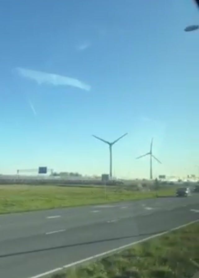 view from inside a moving vehicle, looking out at a multi-lane highway with cars driving on it. On the right side of the road, there is a grassy area with two wind turbines standing in the distance under a clear blue sky. A lamppost is visible on the right edge of the frame. The camera moves slightly due to the vehicle's motion. The glass of the window has some visible water spots.