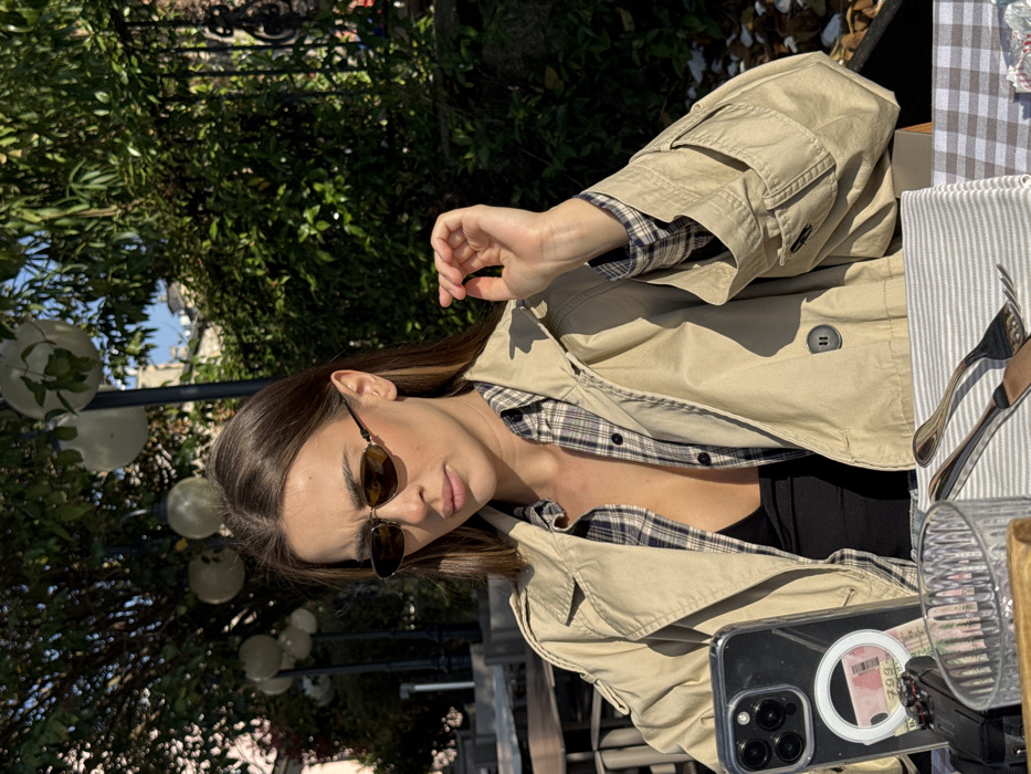 The image displays a female individual seated at an outdoor cafe or restaurant table in Sirmione, Italy, under bright sunlight. She has long, straight, medium brown hair and wears dark-lensed, oval-shaped sunglasses with thin metal frames. Her attire includes a light beige trench coat over a plaid shirt (featuring blue, black, and white checks) unbuttoned to reveal a black top. Her right hand is raised, fingers slightly curled, positioned near her chin. On the table, a clear iPhone in a clear case with a white circular ring attachment stands upright, with visible currency folded inside the case behind the phone. A clear fluted glass and metal cutlery (a fork and a knife) rest on a white and grey striped tablecloth. The background features lush green foliage, several spherical white outdoor light fixtures, and distant architectural elements under a clear blue sky.
