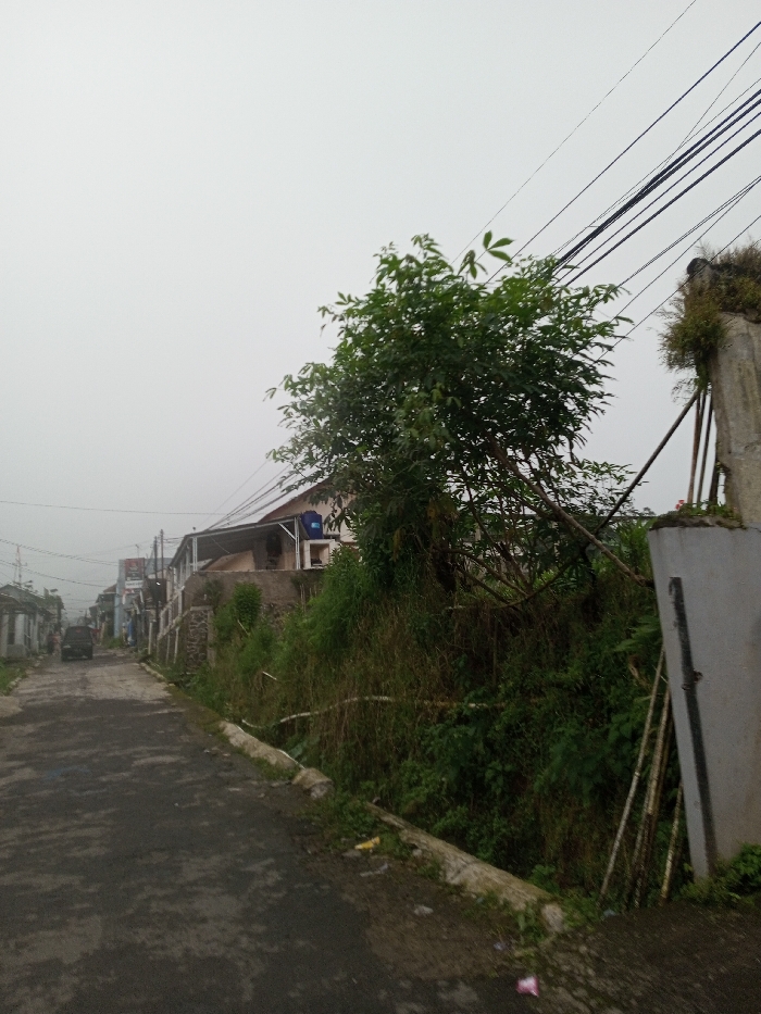 This image depicts a residential street scene in Ambakirano, Madagascar, under an overcast sky providing diffused light. The foreground shows a dark, wet asphalt road curving slightly uphill to the left. Concrete curbs border the road on both sides, with some scattered debris or litter visible on the left curb and road surface. To the right of the road, a dense embankment of green vegetation, including shrubs and taller plants, rises sharply. Partially obscured behind this foliage is a single-story house with a blue water tank visible on its exterior wall. Further to the right, a concrete utility pole or structure stands, supporting multiple dark electrical or communication lines that traverse the upper right quadrant of the image. Several bamboo poles lean against this concrete structure. In the distant background, along the left side of the road, a series of modest residential buildings with various roof types line the street. A dark-colored vehicle is visible on the road further up, and faint figures of individuals are discernible near these buildings. The sky is uniformly light grey, indicating heavy cloud cover or fog. No clear human actions or interactions are prominently featured.