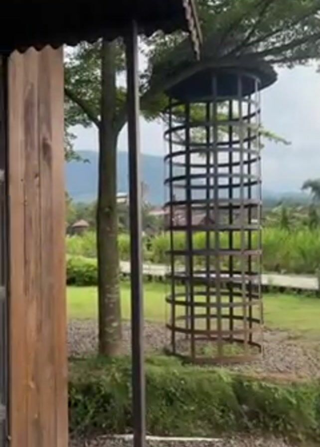 view from outside to inside a building with large windows. Outside, there is a metal cage structure and lush greenery. Inside, people are sitting around a wooden table, appearing to be engaged in conversation. The interior has a rustic design with concrete walls and dark wood beams. A tall ornate mirror stands near the windows. The overall setting is calm and relaxed, with a view of the natural landscape.