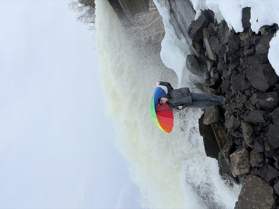 The image captures an individual standing on a rocky embankment next to a powerful gush of water, likely a dam spillway or artificial waterfall, under an overcast sky in the city of Chernushka, Russia. The central figure is an adult, dressed in dark attire, including a dark beanie or cap, dark sunglasses, a dark grey sweater, a black quilted vest, dark trousers, and dark shoes. They hold a brightly colored rainbow umbrella in their left hand, tilted slightly open. Their right hand is raised in a clear waving gesture towards the viewer. Behind and to the left of the person, a massive volume of turbulent, foamy, light-colored water cascades downwards, generating significant spray. The water appears to flow from a dark grey concrete structure or wall visible in the upper right. The immediate ground around the person consists of numerous large, dark grey to black rocks. Patches of white snow and ice are present on the lower right, indicating cold conditions. Bare trees or shrubs are visible on a bank in the upper right background, above the water source. The sky is a uniform light grey, characteristic of an overcast day.