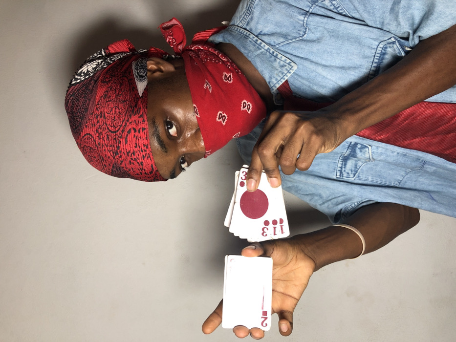 A male individual is depicted in a chest-up, close-up shot against a plain light grey wall in Ngleshi Amanfro, Ghana. He wears a red bandana with a black paisley pattern on his head, partially revealing white and black patterned fabric on the left side. A second red bandana, featuring white paisley patterns, serves as a mask covering his nose and mouth. His dark eyes are fixed directly on the camera. He is dressed in a light blue denim short-sleeved shirt, under which a red tie is visible. A light-colored bracelet is present on his left wrist. He holds two stacks of white playing cards: the stack in his left hand displays a red '2' on its visible face, while the fanned stack in his right hand shows a top card with a prominent red circle in the center and red numbers '11' and '3' (or '13') accompanied by red dots vertically arranged on the left.