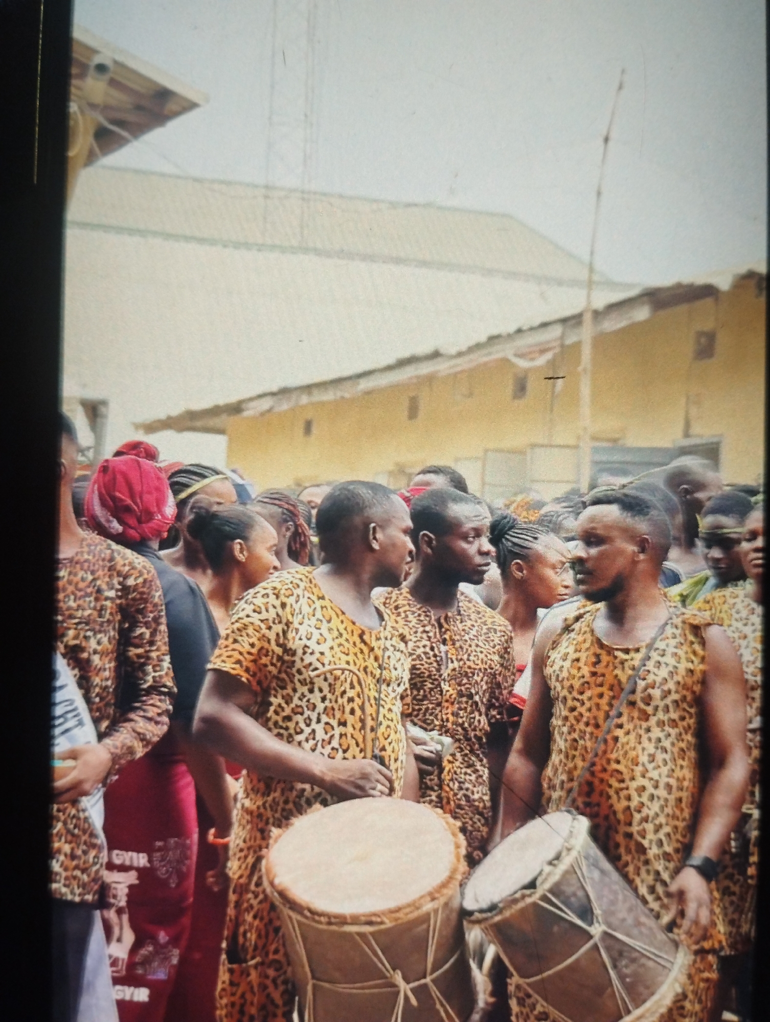 This image captures an outdoor gathering in Akwanga, Nigeria. A dense crowd of individuals of African descent occupies the foreground and midground. Several men are prominently featured wearing garments patterned with a leopard print; one man in a short-sleeved tunic stands centrally, while another on the right wears a sleeveless top with a dark strap across his shoulder, also exhibiting a dark wristwatch. Two traditional drums are visible in the immediate foreground: a lighter-toned, laced drum on the left, and a darker, cylindrical, laced drum with a visible carrying strap on the right. Other individuals in the crowd include a woman with a red headwrap and black top, and another person wearing a red skirt featuring white "GYIR" text. The background consists of a light-colored building with a sloped, possibly corrugated roof, and a yellowish-walled building further back, all beneath an overcast sky. A thin, bare wooden pole extends vertically in the distant background. Individuals are standing in close proximity, appearing to observe or participate in an event.