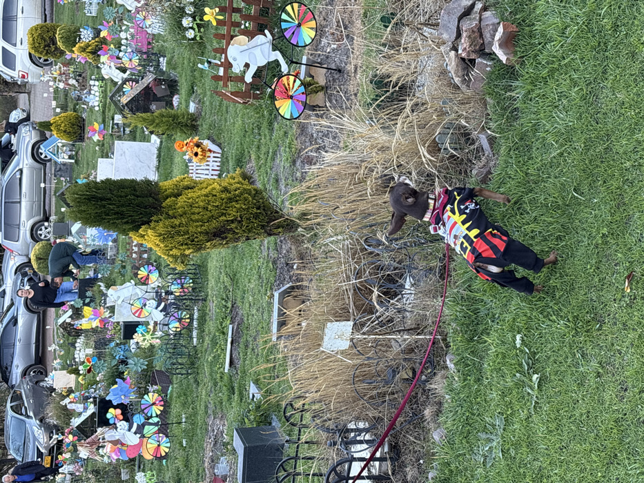 The image displays a detailed view of a cemetery section in Casco Urbano, Colombia, characterized by numerous vibrantly decorated graves. In the immediate foreground, a small, dark-brown dog, possibly a chihuahua or miniature pinscher, is positioned on green grass, facing right and slightly upwards, appearing to sniff or observe something within a patch of tall, dry, light-brown grass. The dog is wearing a black, red, and yellow full-body suit with a pirate motif, and a red leash extends from its collar out of frame to the left. A dark metal fence with circular designs runs behind the dry grass. The midground is densely packed with individual grave sites, each featuring elaborate and colorful decorations. These include numerous spinning pinwheels with multicolored vanes, miniature white picket fences, small house-like structures, small statues (such as a white dog on a bicycle), and small evergreen shrubs or topiaries. Some graves are marked by dark or light-colored headstones. In the background, three individuals are visible among the graves. A woman in a dark shirt and blue jeans stands near a dark headstone, looking towards a man. This man, dressed in a dark green long-sleeved shirt and blue jeans, is bent over a grave, seemingly tending to it. Another man in a dark blue jacket is partially visible on the far left. Beyond the grave area, a line of parked vehicles, including sedans and SUVs in shades of silver, gray, and dark blue, suggests an adjacent road or parking area. The scene is illuminated by ambient light, consistent with an overcast sky.