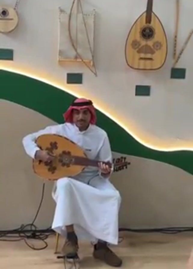 A man wearing traditional Saudi Arabian clothing (a white thobe and a red and white shemagh) sits on a small stool and plays an oud, a pear-shaped stringed instrument
