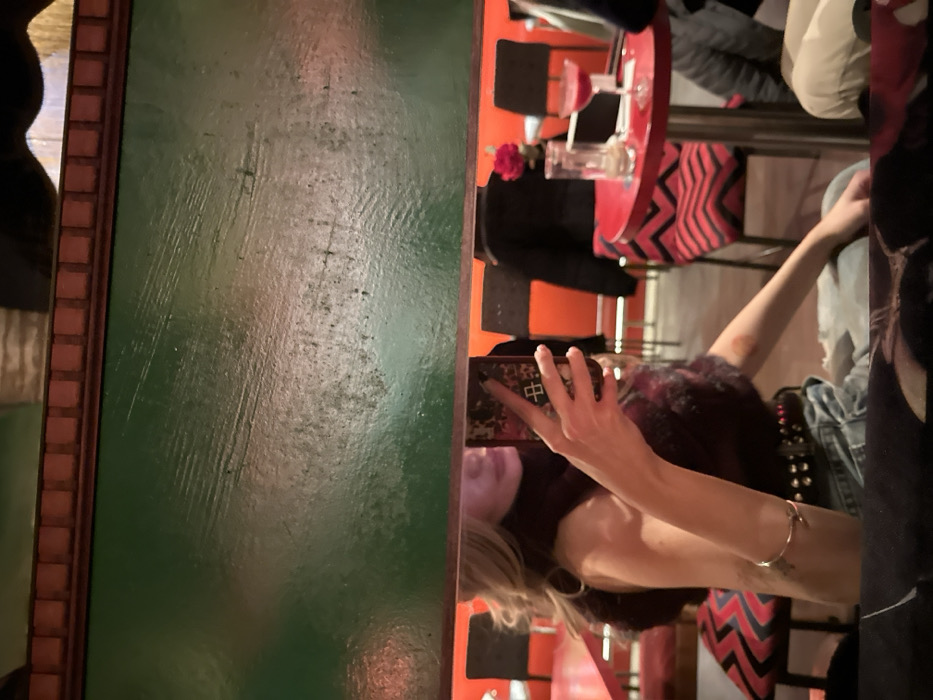 A person in a sleeveless fur vest takes a mirror selfie. The phone case is decorated and partially obscures the face. A red, round table with drinks and a flower is visible behind the person, along with zig-zag patterned chairs and a bright orange wall. A large green, possibly wooden, structure is visible on the left side of the mirror's reflection.