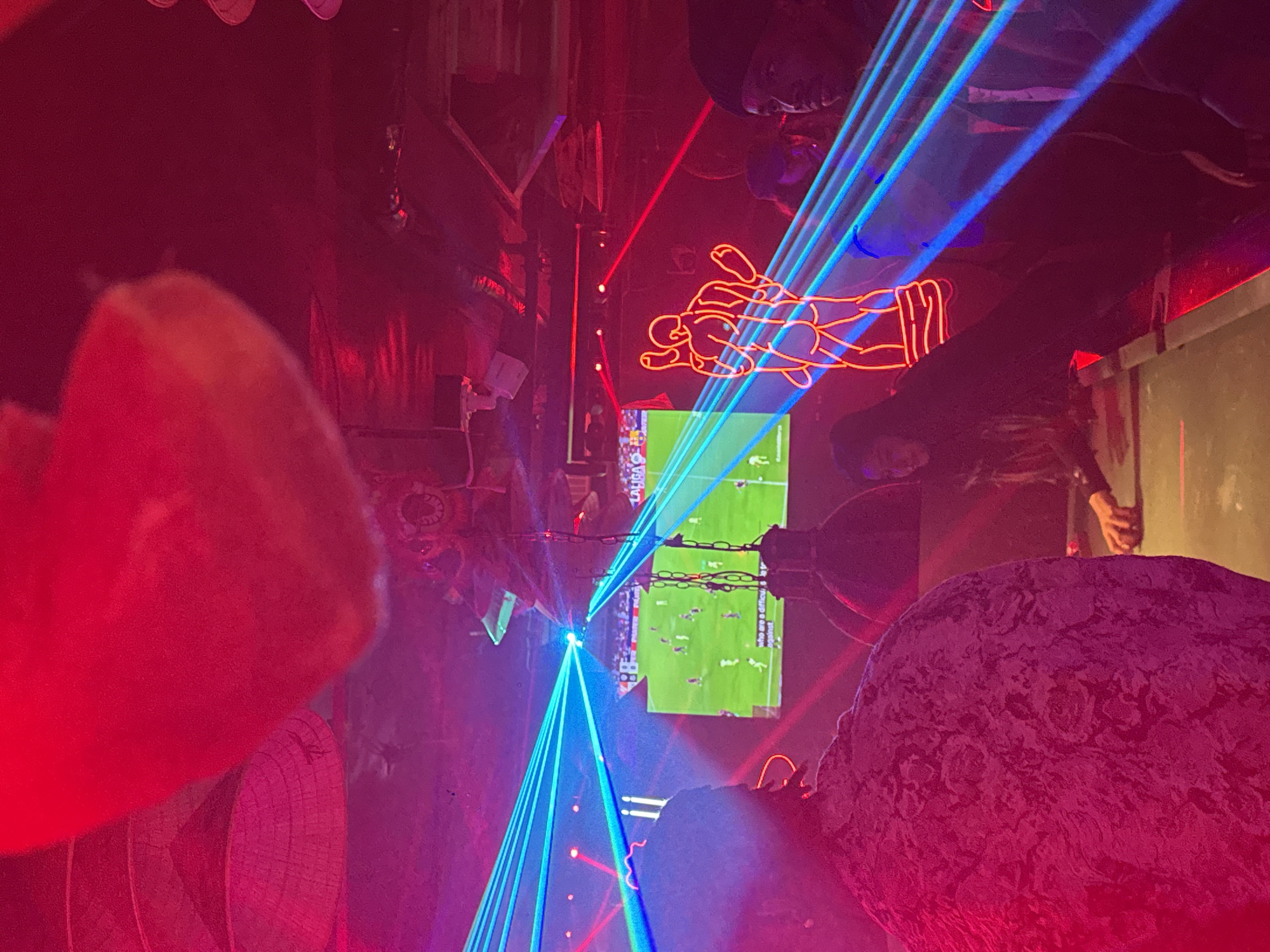 - "The image depicts an indoor entertainment venue, likely a bar or club, characterized by saturated red and blue artificial lighting, including visible blue laser beams" by FM-sKB6l1, licensed under CC BY 4.0