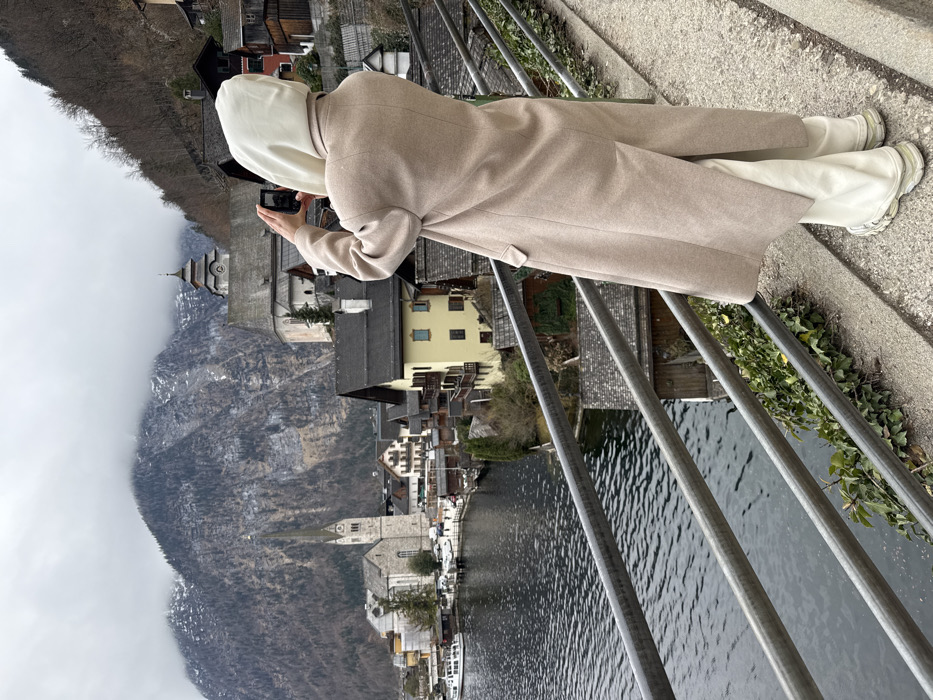 A single individual, viewed from behind, stands on a paved path overlooking Hallstätter See and the historic village of Hallstatt, Austria. The person, positioned in the right-center of the foreground, wears a long, light tan overcoat, a cream-colored hood pulled over their head, light-colored wide-leg pants, and bulky athletic shoes. Both hands hold a black smartphone horizontally at eye level, aimed towards the village, indicating the action of photographing the scene. A three-bar grey metal railing separates the path from the lake. Beneath the railing, green, vine-like vegetation grows along the path's edge. The dark, rippled water of Hallstätter See occupies the midground on the left, with several white boats docked along the far shore. The village of Hallstatt unfolds across the midground, with numerous traditional buildings featuring dark roofs and facades of wood or stucco, including a prominent yellow building. A grey stone church with a tall, pointed spire is visible on the left side of the village, while higher on the hillside, another stone church with a distinctive clock tower and a layered, pointed roof is evident. In the background, steep, dark mountains rise abruptly, covered with sparse trees and displaying patches of snow near their peaks. The mountain tops are partially obscured by a uniformly grey, overcast sky. The overall environment suggests cool or cold weather conditions.