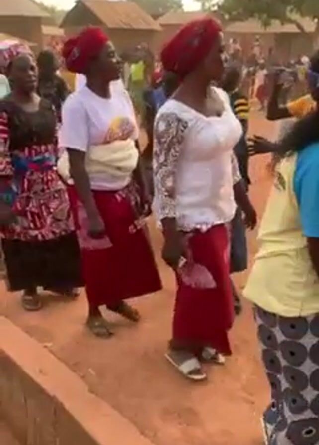 A group of women in a rural area are walking along a dirt road. The women are wearing colorful traditional clothing, including head wraps and long skirts. Some of the women are also wearing white tops. There are other people standing around in the background, and some buildings are visible. The setting appears to be a village or small town in a developing country. The women are moving slowly, possibly in a procession or as part of a cultural event. The atmosphere seems relaxed and communal.