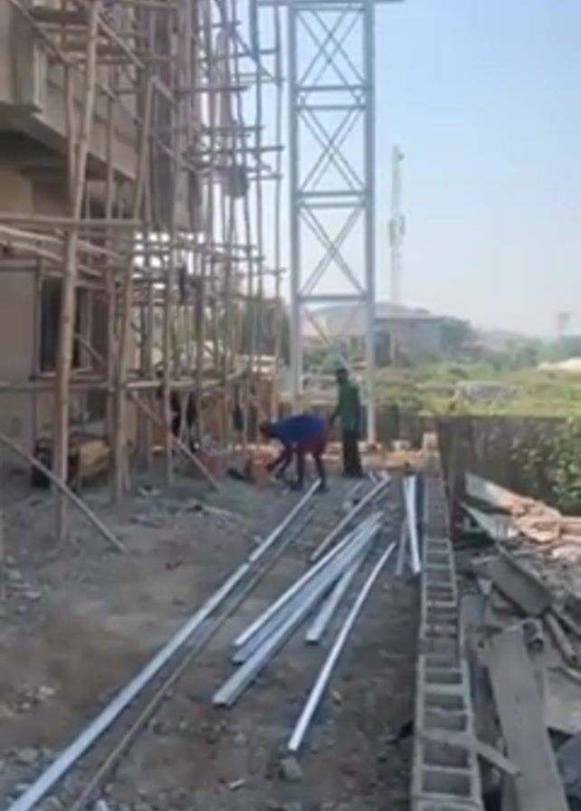 n outdoor construction site. A building is under construction, with bamboo scaffolding erected around its exterior. A tall, white steel tower stands nearby. Several long, white metal pipes lie on the ground. Two men are working near the pipes and a cinder block wall. One man, wearing a blue shirt and red shorts, appears to be operating a tool on the ground. The second man is wearing a green shirt and dark pants. In the background, there are more buildings and greenery, under a clear, light blue sky. Construction debris is scattered around the work area.