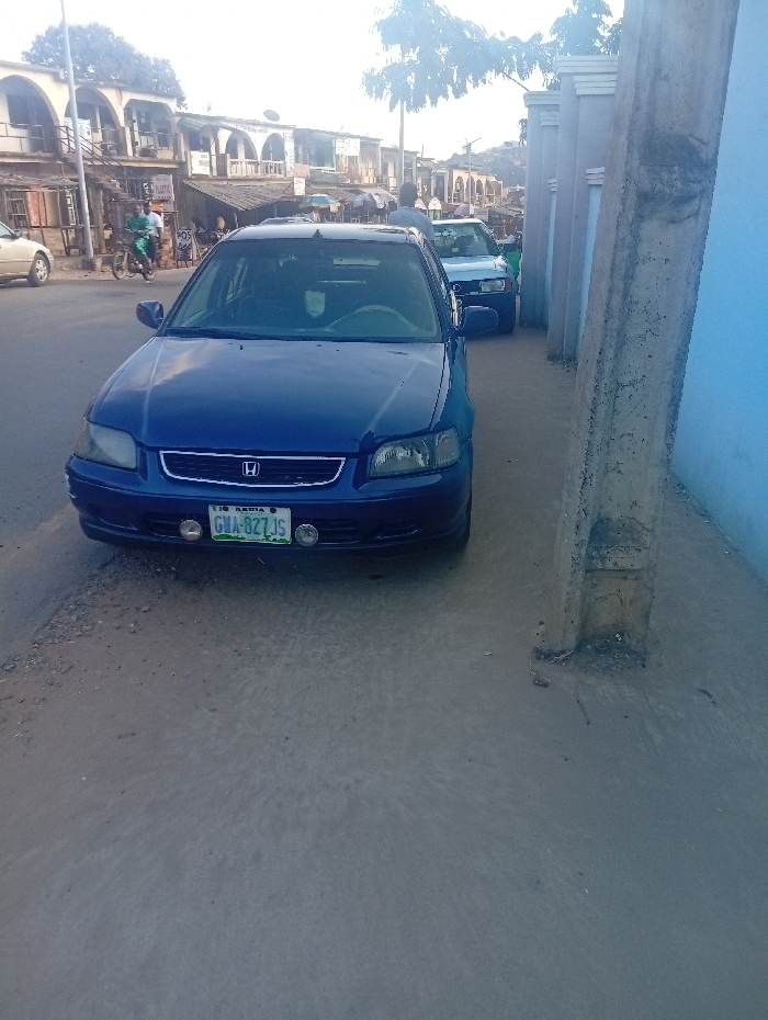 The image depicts an urban street scene in Okene, Nigeria, during daylight hours. In the immediate foreground, a dark blue Honda sedan, bearing Nigerian license plate FCT ABUJA GMA-827JS and equipped with two circular auxiliary lights on its front bumper, is stationary on an unpaved, dusty shoulder. To the right of the vehicle, a light blue wall with white-capped vertical pillars runs parallel to the street, partially obscured by a weathered concrete pillar in the extreme foreground. Beyond the Honda, a paved road is visible, on which a light-colored sedan is partially obscured in the distance. A person in a light-colored shirt is walking away from the camera on this road. Further left, another individual on a motorcycle, wearing a green shirt, is traveling from left to right across the frame. The background is dominated by a continuous line of multi-story buildings, characterized by arched windows and balconies, with visible external wooden or metal supports. Ground-level sections of these buildings feature market stalls or shops, some with umbrellas or awnings. Sparse tree foliage and a hazy sky are visible above the structures, along with a street light pole and a satellite dish.