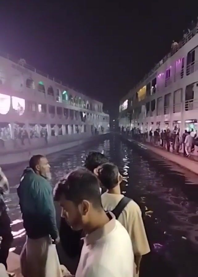 At night, a video shows a narrow waterway between two large, white passenger ships. People line the decks of both ships and the dock. The ships are lit with colored lights. Some people walk on the dock, while others stand and look at the ships. The water is dark and reflective.