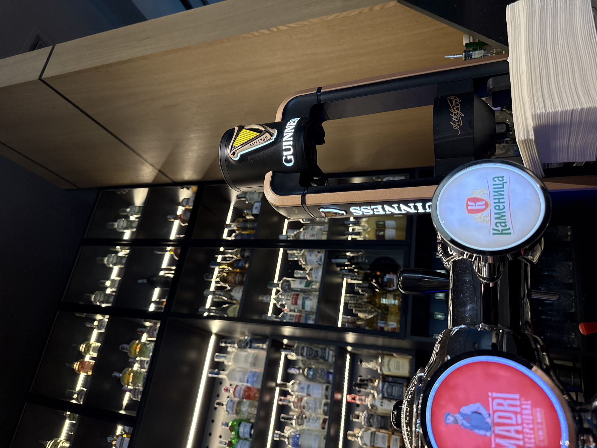 bar setting, likely in Burgas, Bulgaria, given the presence of the "Каменица" (Kamenitza) beer tap, which is a Bulgarian beer brand. The focus is on the beer taps, including Guinness and Madri Excepcional. Behind the taps is a shelving unit filled with various liquor bottles. There is a stack of white napkins to the right. The overhead lighting highlights the liquor bottles and the sheen of the beer tap fixtures.