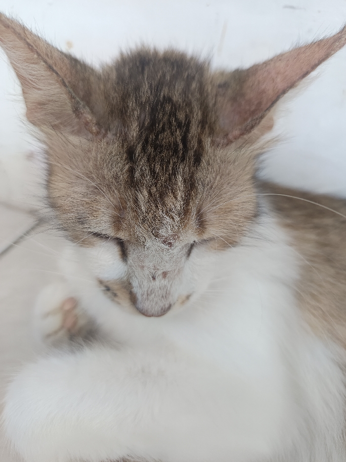 A tabby and white cat is depicted in a close-up, top-down view, resting on a light-colored tiled surface in Maleber, Indonesia. The feline's eyes are closed or nearly closed, and its head is tilted downwards. The fur on its head is a mix of brown and grey tabby stripes, transitioning to white fur on its chest and lower face. Multiple small, reddish-brown lesions or scabs are present on the cat's forehead and bridge of the nose. The fur around the ears and on the inner ear flaps appears somewhat thin or sparse, with slight discoloration or irritation visible. One front paw, with visible pads, is partially obscured by its body near its chin.