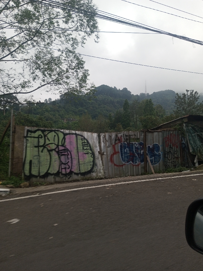 The image depicts an outdoor scene in Jabalpur, India, captured from a moving vehicle. The foreground shows a dark asphalt road with a white demarcation line running parallel to a concrete curb on the right. A portion of a vehicle's side-view mirror is visible in the bottom right. Across the mid-ground, a long, weathered galvanized corrugated metal fence stands, extensively covered in multi-colored graffiti. The left section features large green and pink bubble-style lettering with black outlines, while the center and right sections display blue and red lettering and various tags. Behind the fence, dense green vegetation and trees are visible, with a partially obscured structure draped with tarp on the far right. The background is dominated by a range of lush, forested hills, topped by an overcast, light grey sky. A tall, slender communication tower or antenna is discernible on a distant hill. Multiple dark electrical or communication lines traverse the upper portion of the frame. No individuals or specific actions are visible.