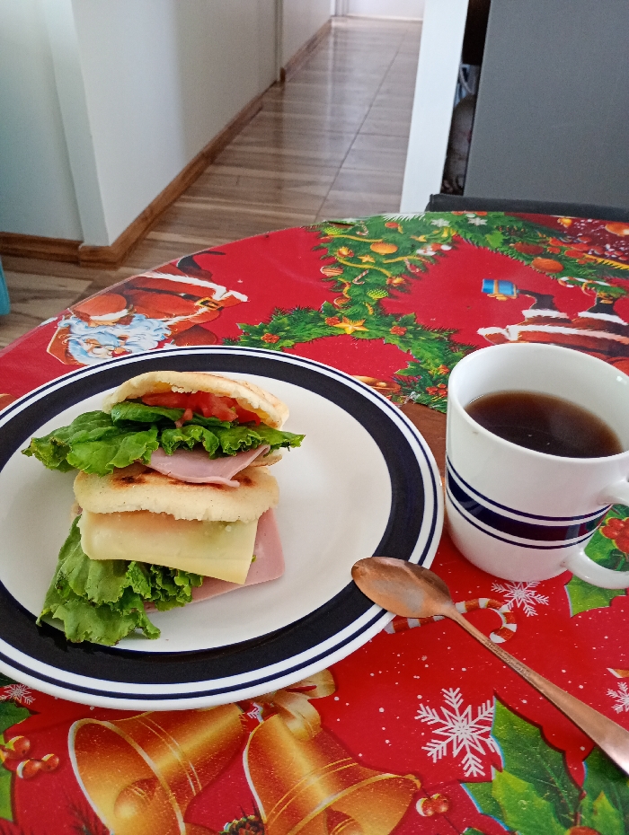 The image displays an indoor setting in Pozo Almonte, Chile, presenting a close-up view of a meal on a table. The table is draped with a red Christmas-themed tablecloth adorned with illustrations of Santa Claus, a Christmas tree, snowflakes, and golden bells. A white, round plate with a dark blue rim holds two stacked circular dough patties, forming two open sandwiches. The top patty contains green lettuce, sliced pink ham, and diced red tomatoes. The bottom patty features green lettuce, sliced pink ham, and a rectangular slice of light yellow cheese. To the right of the plate, a white ceramic mug with two horizontal blue stripes contains a dark brown liquid. A single, copper-toned spoon rests on the tablecloth to the right of the plate. The background reveals a light-colored wall with a wooden baseboard and a wood-look tiled floor extending into a hallway or passage. A dark grey object, possibly part of a chair or furniture, is partially visible on the far right.