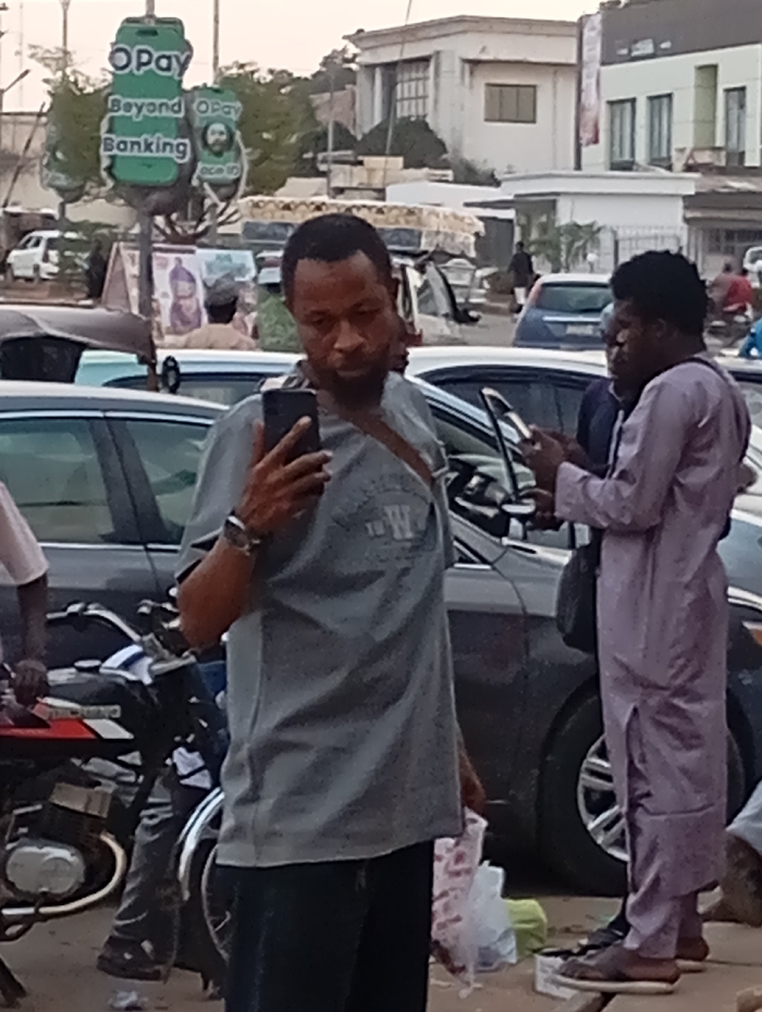 A man in a gray shirt holds a smartphone. Beside him, another man in a lilac robe also looks at his phone. A motorcycle is parked near the first man. Behind them, cars line the street, and several buildings are visible in the background, including one with "OPay" signage. People can be seen walking and standing around the vehicles, indicating a busy street scene.