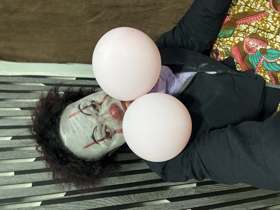 A single individual is depicted indoors in Accra, Ghana, portraying a character with horror-style clown makeup
