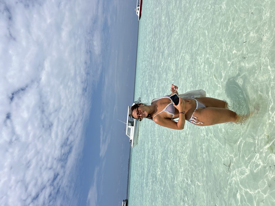 A woman stands in shallow, clear turquoise water near boats. She wears a white bikini and sunglasses and holds a smartphone. The sky, filled with scattered clouds, dominates the background. The horizon line bisects the image, showing the transition from water to sky.